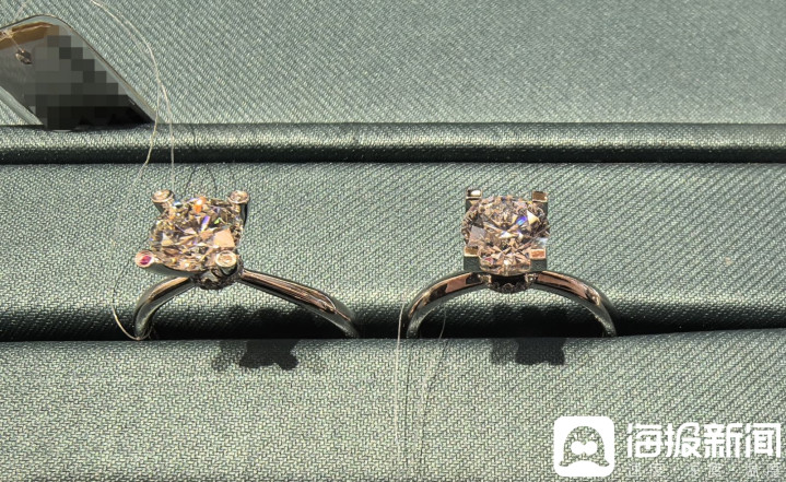 济南一家销售钻石饰品店铺里展示的1克拉自然钻石(左)和援救钻石(右)。
